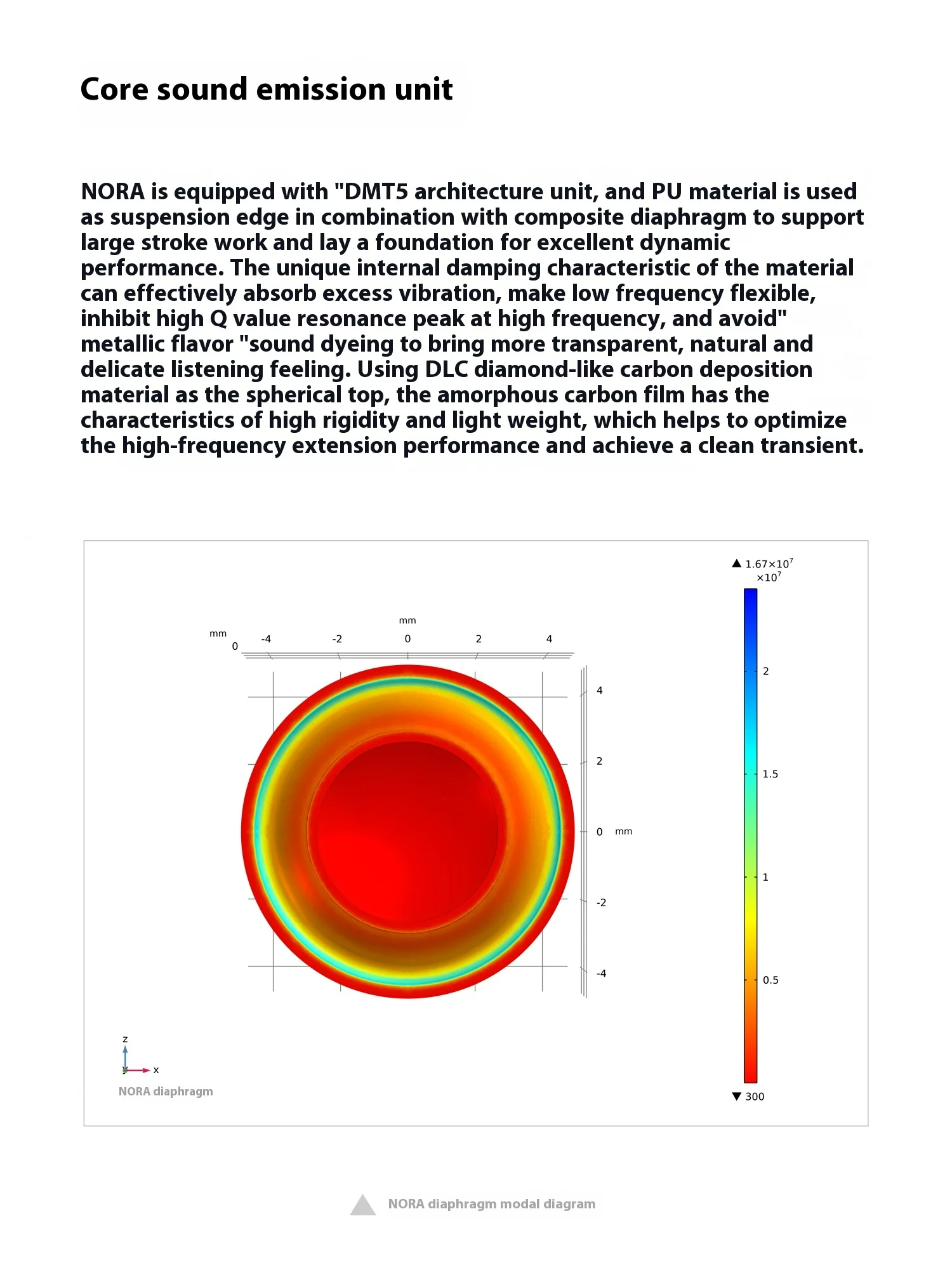 > NORA's DMT5 dynamic driver features a PU suspension and composite diaphragm for extended excursion and dynamic range. PU damping absorbs excess vibration for elastic bass and controlled highs, while the DLC dome delivers high rigidity, low mass, and exceptional treble extension with clean transients.