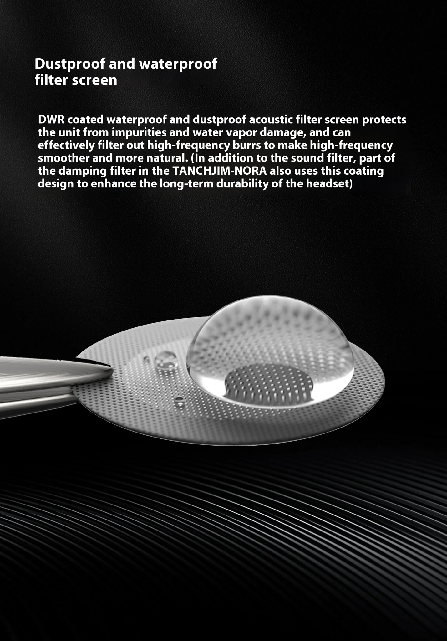 > A DWR-coated acoustic mesh protects the driver from dust and moisture while softening treble harshness. Both the nozzle mesh and internal damping filters use this coating for enhanced long-term durability.
