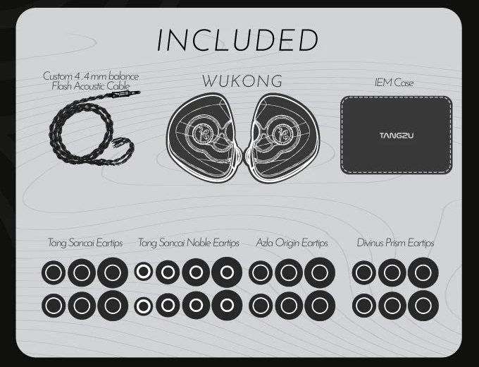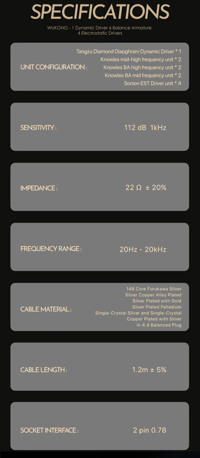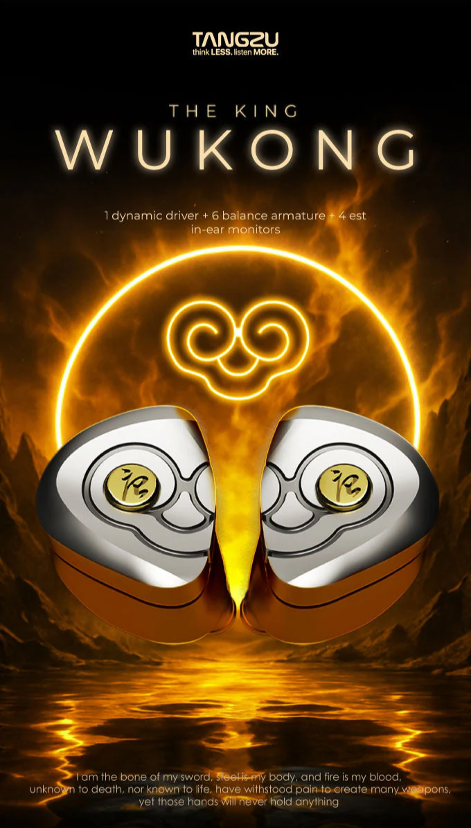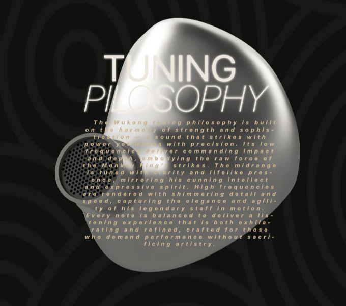 > The Wukong tuning philosophy is built on the harmony of strength and sophistication. A sound that strikes with power yet moves with precision. Its low frequencies deliver commanding impact and depth, embodying the raw force of the Monk King's strikes. The midrange is tuned with clarity and lifelike presence, mirroring his cunning intellect and expressive spirit. High frequencies are rendered with shimmering detail and speed, capturing the elegance and agility of his legendary staff in motion. Every note is balanced to deliver a listening experience that is both exhilarating and refined, crafted for those who demand performance without sacrificing artistry.