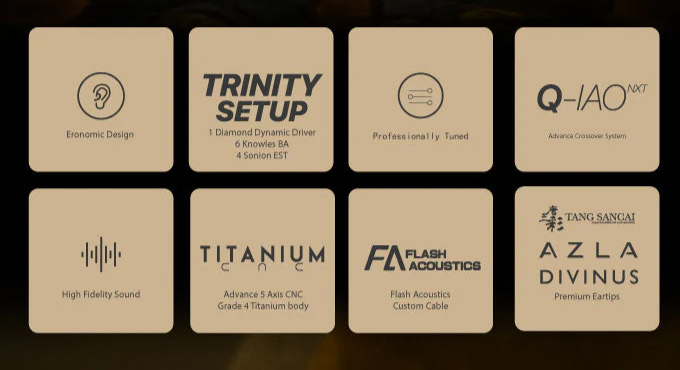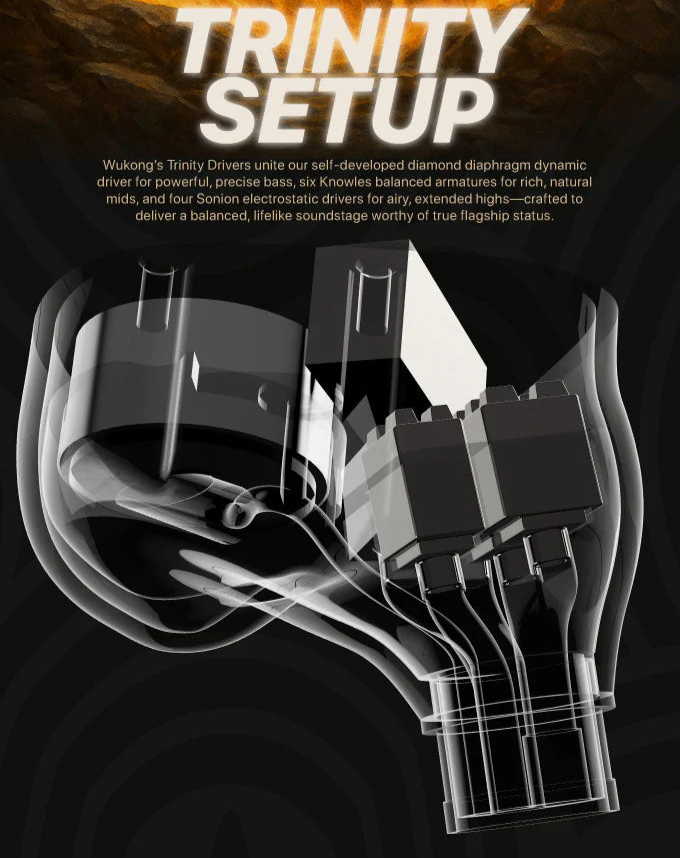 > Wukong's Trinity Drivers unite our self-developed diamond diaphragm dynamic driver for powerful, precise bass, six Knowles balanced armatures for rich, natural mids, and four Sonion electrostatic drivers for airy, extended highs - crafted to deliver a balanced, lifelike soundstage worthy of true flagship status.