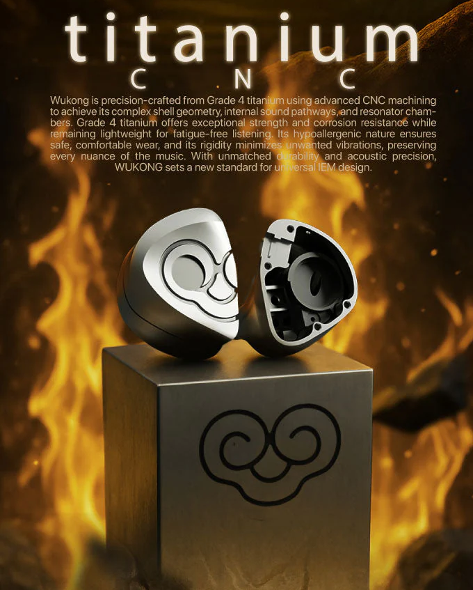 > Wukong is precision-crafted from Grade 4 titanium using advanced CNC machining to achieve its complex shell geometry, internal sound pathways, and resonator chambers. Grade 4 titanium offers exceptional strength and corrosion resistance while remaining lightweight for fatigue-free listening. Its hypoallergenic nature ensures safe, comfortable wear, and its rigidity minimizes unwanted vibrations, preserving every nuance of the music. With unmatched durability and acoustic precision, Wukong sets a new standard for universal IEM design.