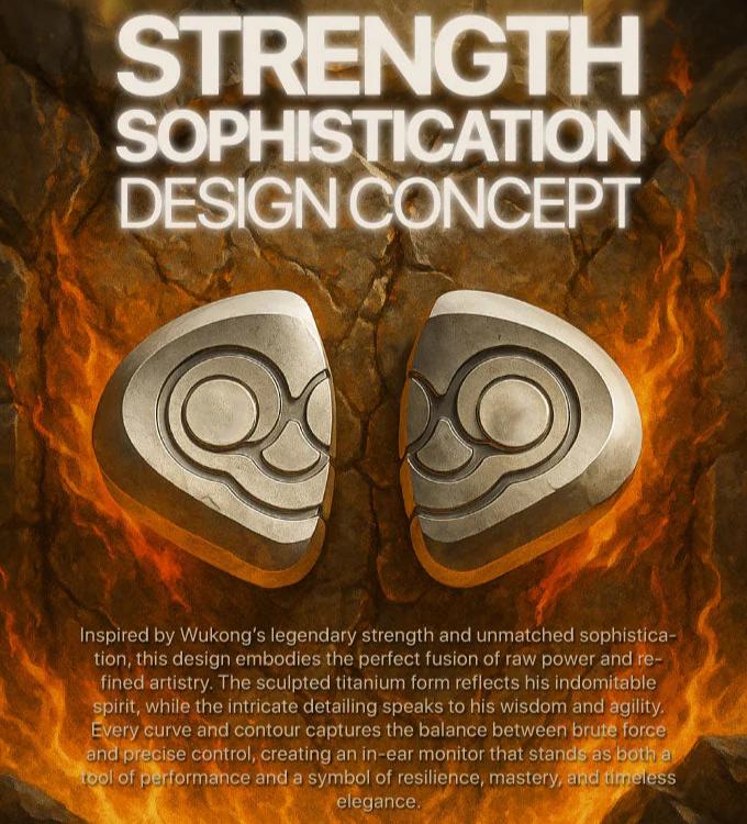 > Inspired by Wukong's legendary strength and unmatched sophistication, this design embodies the perfect fusion of raw power and refined artistry. The sculpted titanium form reflects his indomitable spirit, while the intricate detailing speaks to his wisdom and agility. Every curve and contour captures the balance between brute force and precise control, creating an in-ear monitor that stands as both a tool of performance and a symbol of resilience, mastery, and timeless elegance.