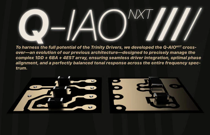 > To harness the full potential of the Trinity Drivers, we developed the Q-IAO NXT cross-over - an evolution of our previous architecture - designed to precisely manage the complex 1DD + 6BA + 4EST array, ensuring seamless driver integration, optimal phase alignment, and a perfectly balanced tonal response across the entire frequency spectrum.