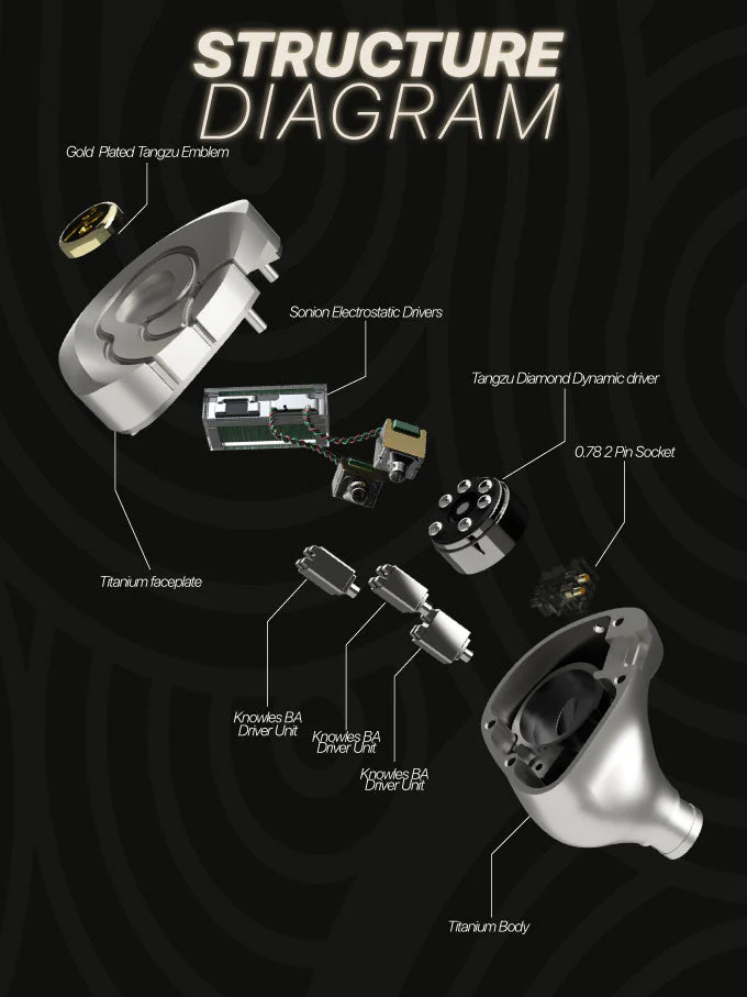 > Unit Configuration: Tangzu Diamond Diaphgram Dynamic Driver *1, Knowles Mid-High Frequency Unit *2, Knowles BA High Frequency Unit *2, Knowles BA Mid Frequency Unit *2, Sonion EST Driver Unit *4
