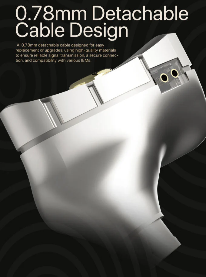 > A 0.78mm detachable cable designed for easy replacement or upgrades, using high-quality materials to ensure reliable signal transmission, a secure connection, and compatibility with various IEMs.