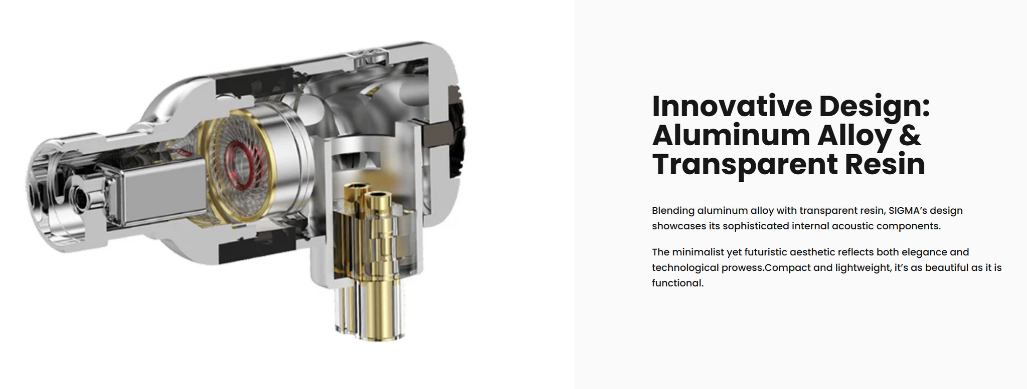 Crafted from a blend of aluminum alloy and transparent resin, the design of the SIGMA is not only striking but also functional. This combination ensures a lightweight, compact structure while housing sophisticated internal components that enhance audio quality. The minimalist yet futuristic aesthetic makes this product both elegant and modern, fitting seamlessly into any audio setup.