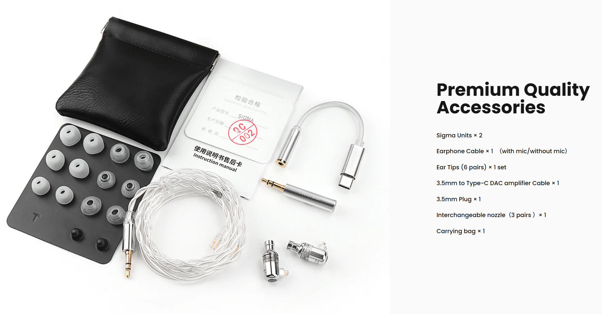To provide optimal conductivity and minimize signal loss, the SIGMA is equipped with a high-purity silver-plated oxygen-free copper cable. This combination enhances sound clarity and detail, ensuring that your music is rich and vibrant. Additionally, the ear monitors come with a range of accessories, including a high-performance DAC adapter that supports up to 32-bit/384kHz sampling, allowing for studio-grade sound reproduction.