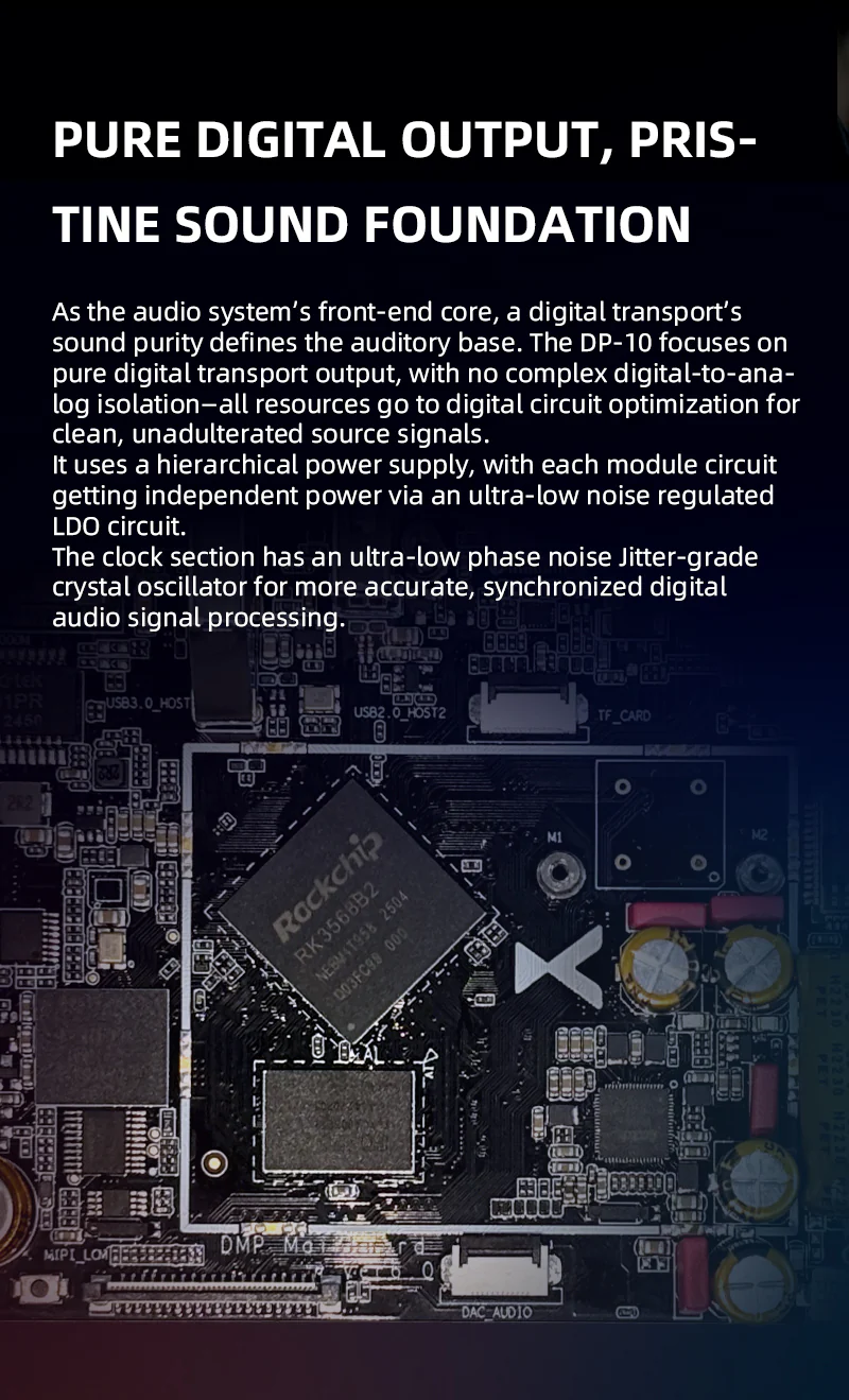 > As the front-end core of any audio system, DP-10 prioritizes pure digital transport output. Its hierarchical power supply provides independent ultra-low-noise regulated LDO circuits to each module, while a jitter-grade crystal oscillator ensures precise, synchronized digital audio processing for unadulterated source signals.