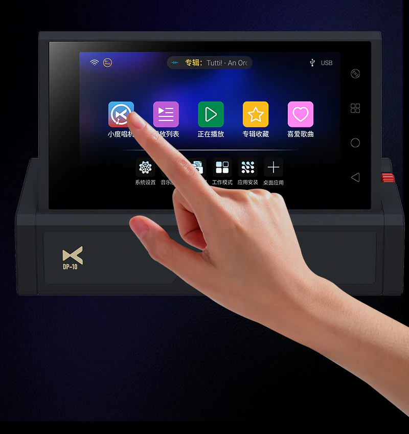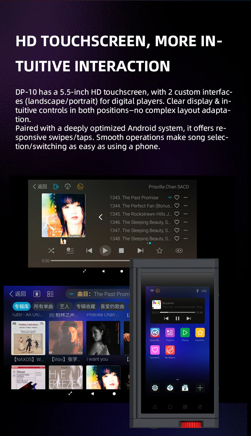 > Featuring a 5.5-inch HD touchscreen with landscape and portrait modes, DP-10 provides a clear and responsive interface for navigation. A deeply optimized Android system enables smooth swipes and taps, while the remote app allows playback and playlist management from Android, iOS, or Windows devices.