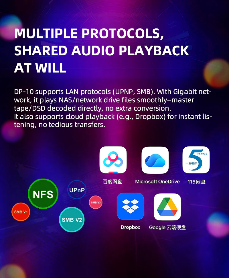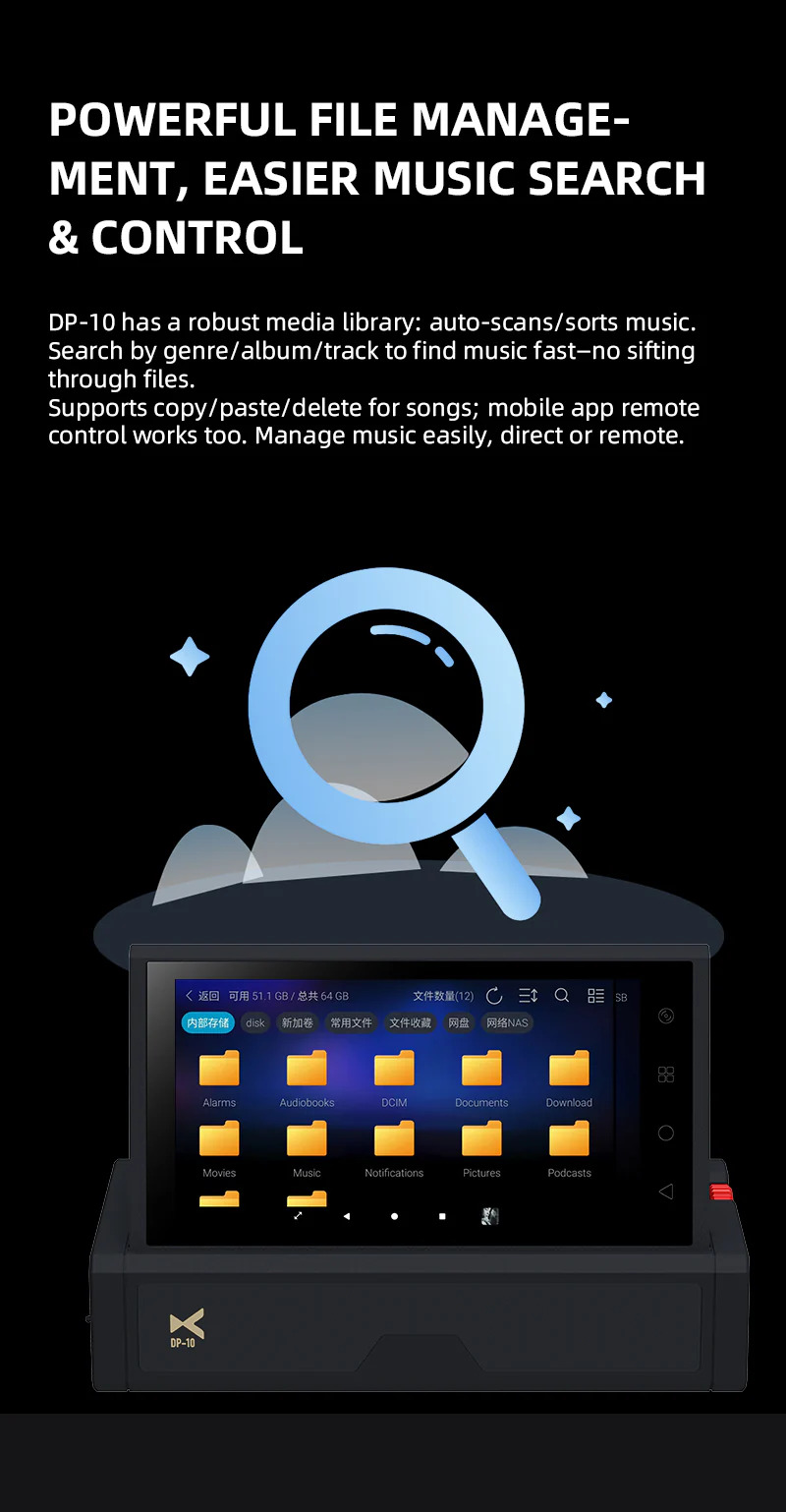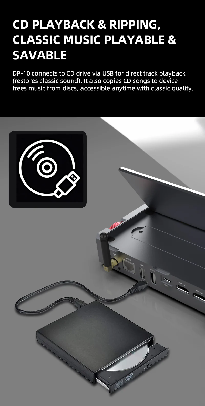 > The DP-10 supports every listening scenario, from local storage, USB drives, SD cards, and hard drives to cloud streaming, LAN, casting, Bluetooth, and CD playback. Handle both offline files and online music effortlessly, accommodating modern users’ diverse audio sources with ease.