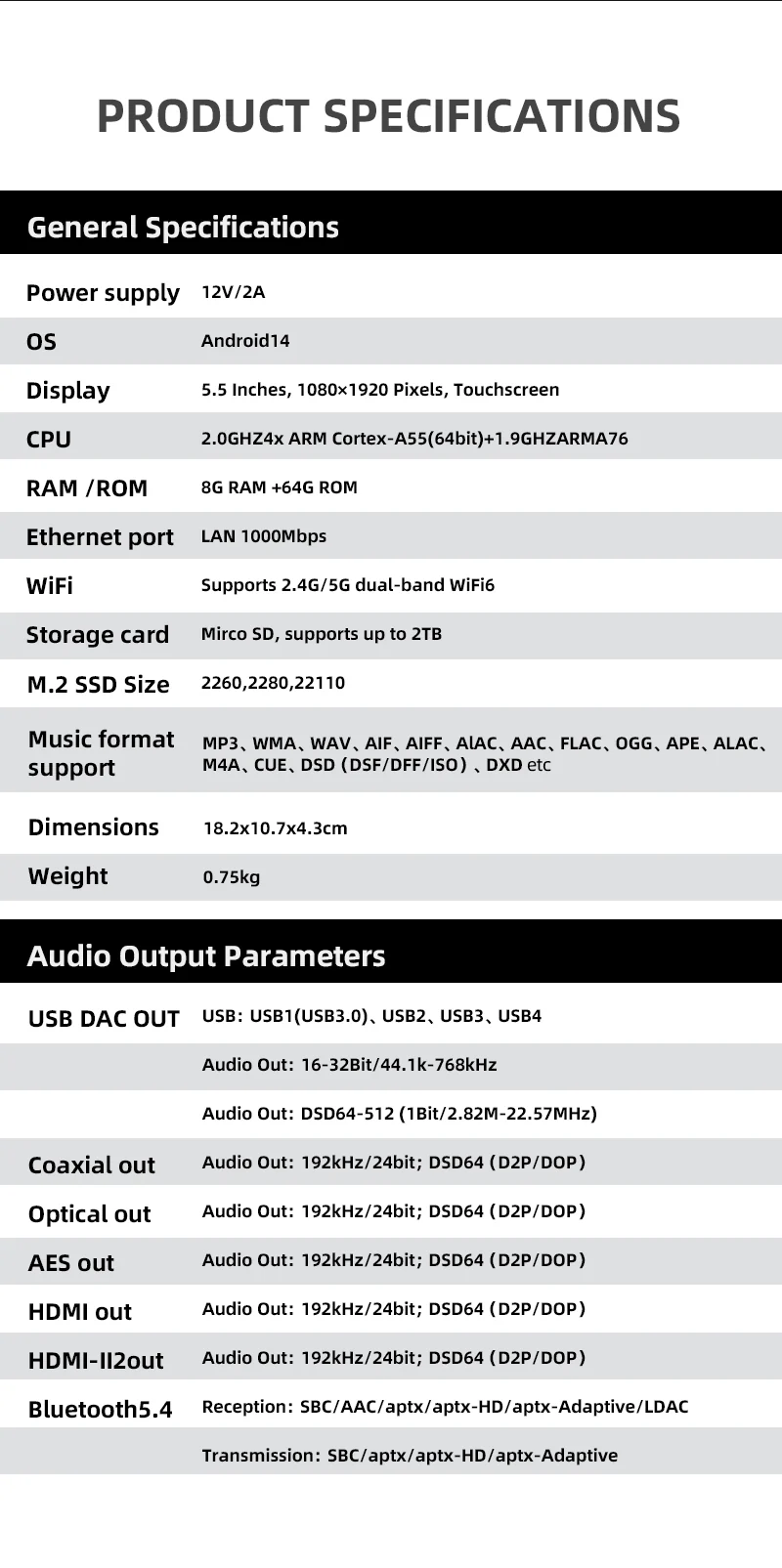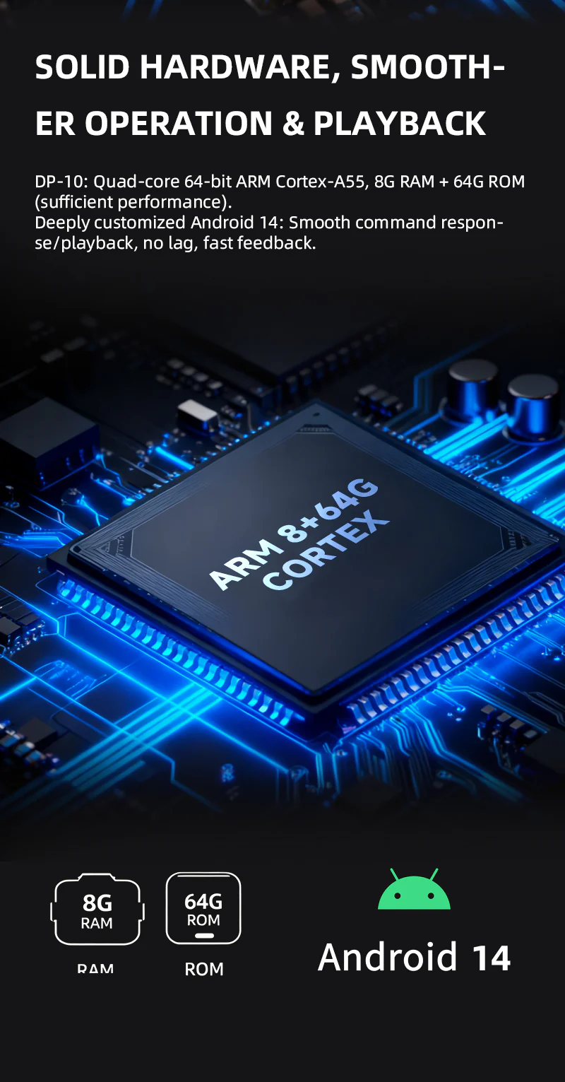 > Powered by a quad-core ARM Cortex-A55 CPU, 8GB RAM, 64GB ROM, and Android 14, DP-10 delivers smooth, lag-free operation. Bluetooth 5.4 supports aptX, aptX-HD, aptX Adaptive, LDAC, and more, ensuring wireless audio without compromise.