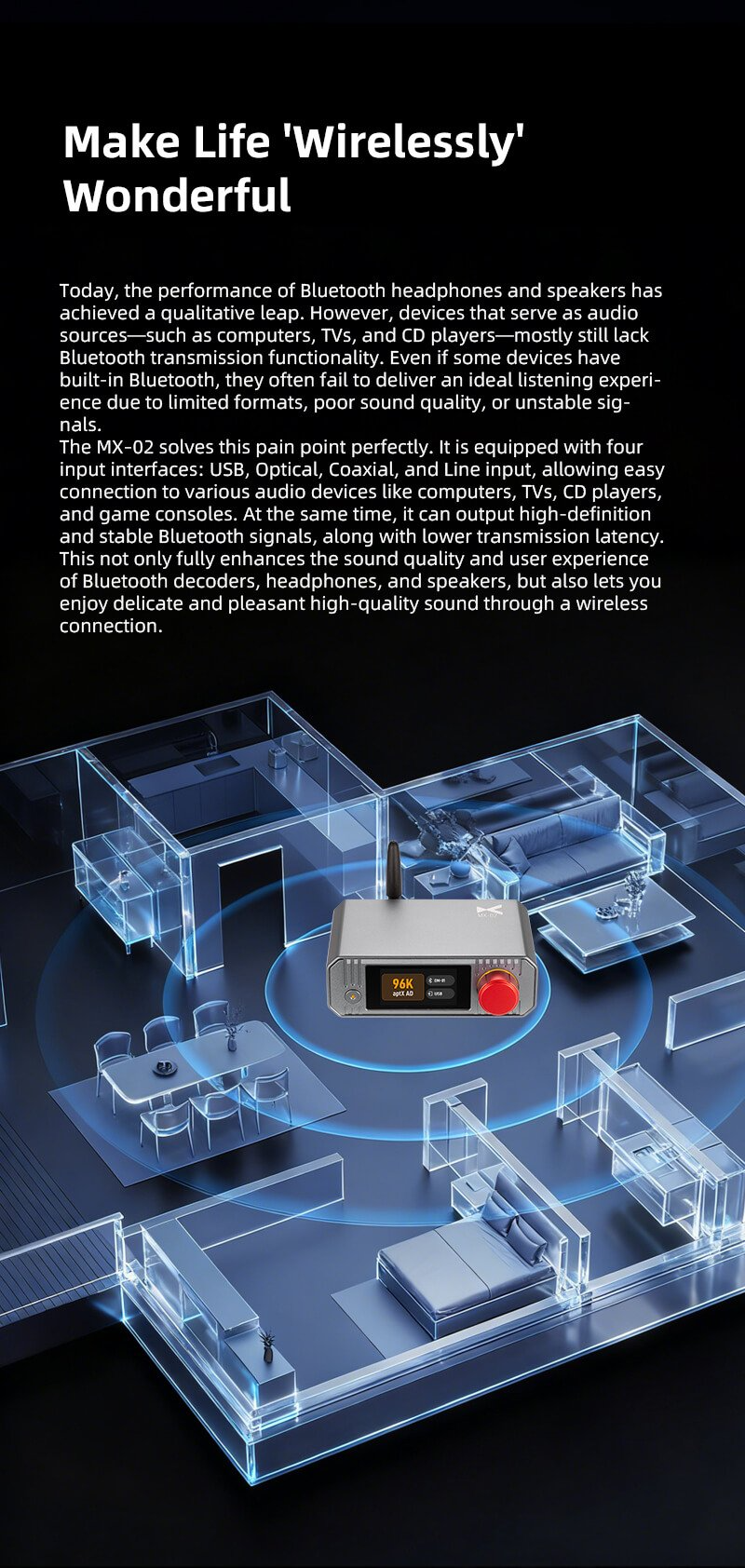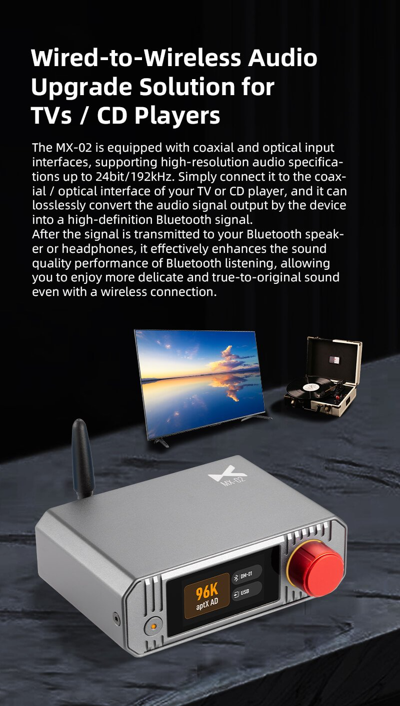 > The MX-02 solves this pain point perfectly. It is equipped with four input interfaces: USB, Optical, Coaxial, and Line input, allowing easy connection to various audio devices like computers, TVs, CD players, and game consoles. At the same time, it can output high-definition and stable Bluetooth signals, along with lower transmission latency. This not only fully enhances the sound quality and user experience of Bluetooth decoders, headphones, and speakers, but also lets you enjoy delicate and pleasant high-quality sound through a wireless connection.