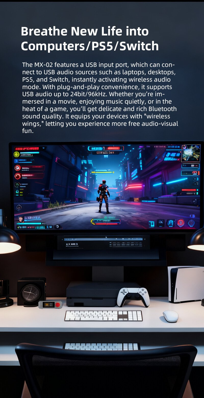 > The MX-02 features a USB input port, which can connect to USB audio sources such as laptops, desktops, PS5, and Switch, instantly activating wireless audio mode. With plug-and-play convenience, it supports USB audio up to 24bit/96kHz. Whether you're immersed in a movie, enjoying music quietly, or in the heat of a game, you'll get delicate and rich Bluetooth sound quality. It equips your devices with "wireless wings", letting you expereince more free audio-visual fun.