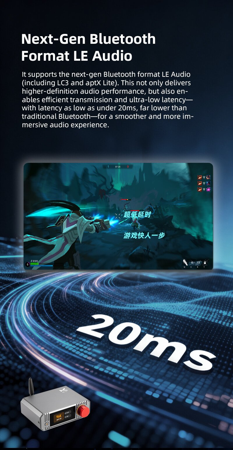 > It supports the next-gen Bluetooth format LE Audio (including LC3 and aptX Lite). This not only delivers high-definition audio performance, but also enablees efficient transmission and ultra-low latency - with latency as low as under 20ms, far lower than traditional Bluetooth - for a smoother and more immerisive audio experience.