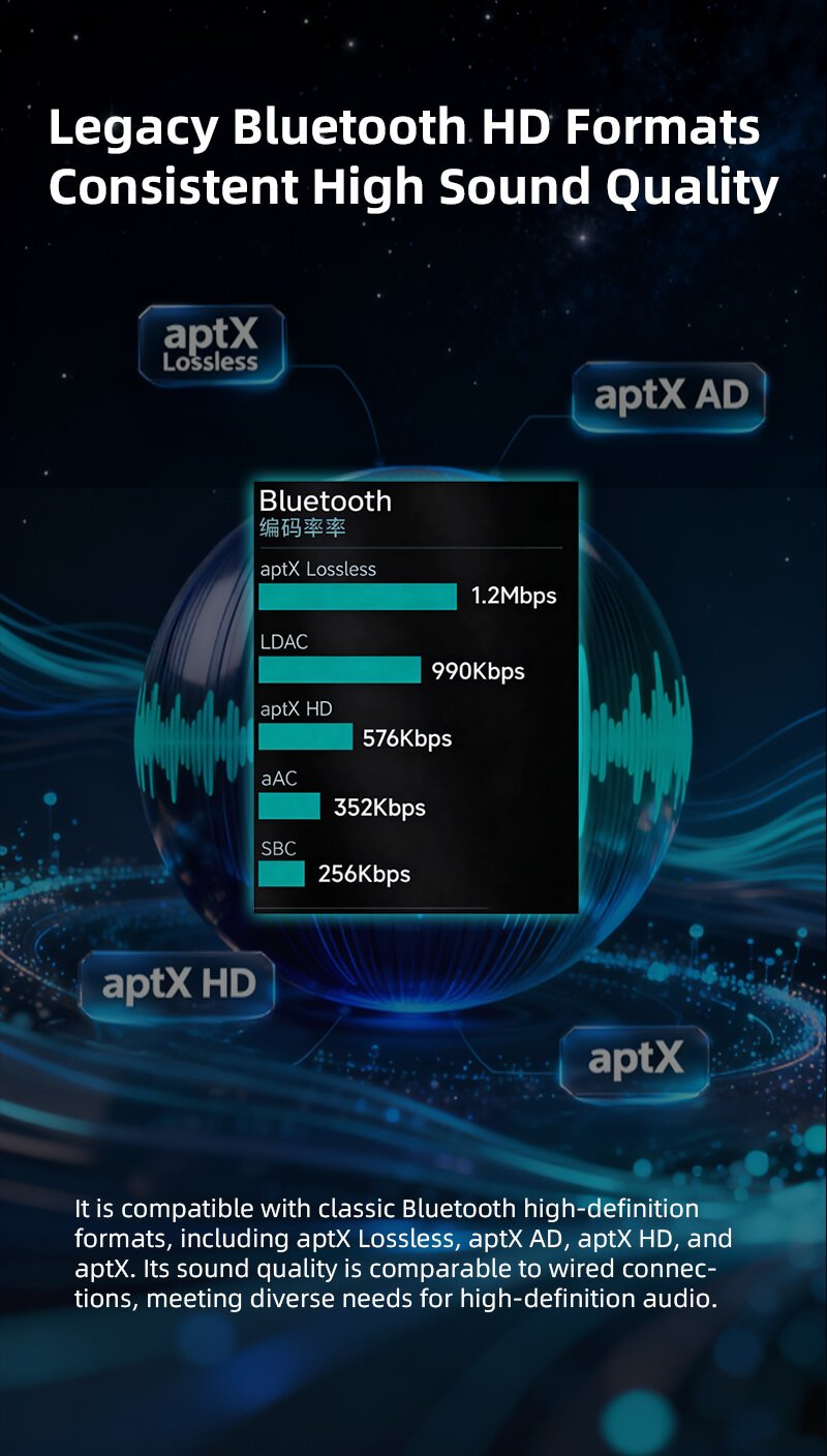 > It is compatible with classic Bluetooth high-definition formats, including aptX Lossless, aptX AD, aptX HD, and aptX. Its sound quality is comparable to wired connections, meeting diverse needs for high-definition audio.