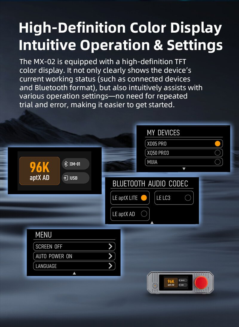 > The MX-02 is equipped with a high-definition TFT color display. It not only clearly shows the device's current working status (such as connected devices and Bluetooth format), but also intuitively assists with various operation settings - no need for repeated trial and error, making it easier to get started.