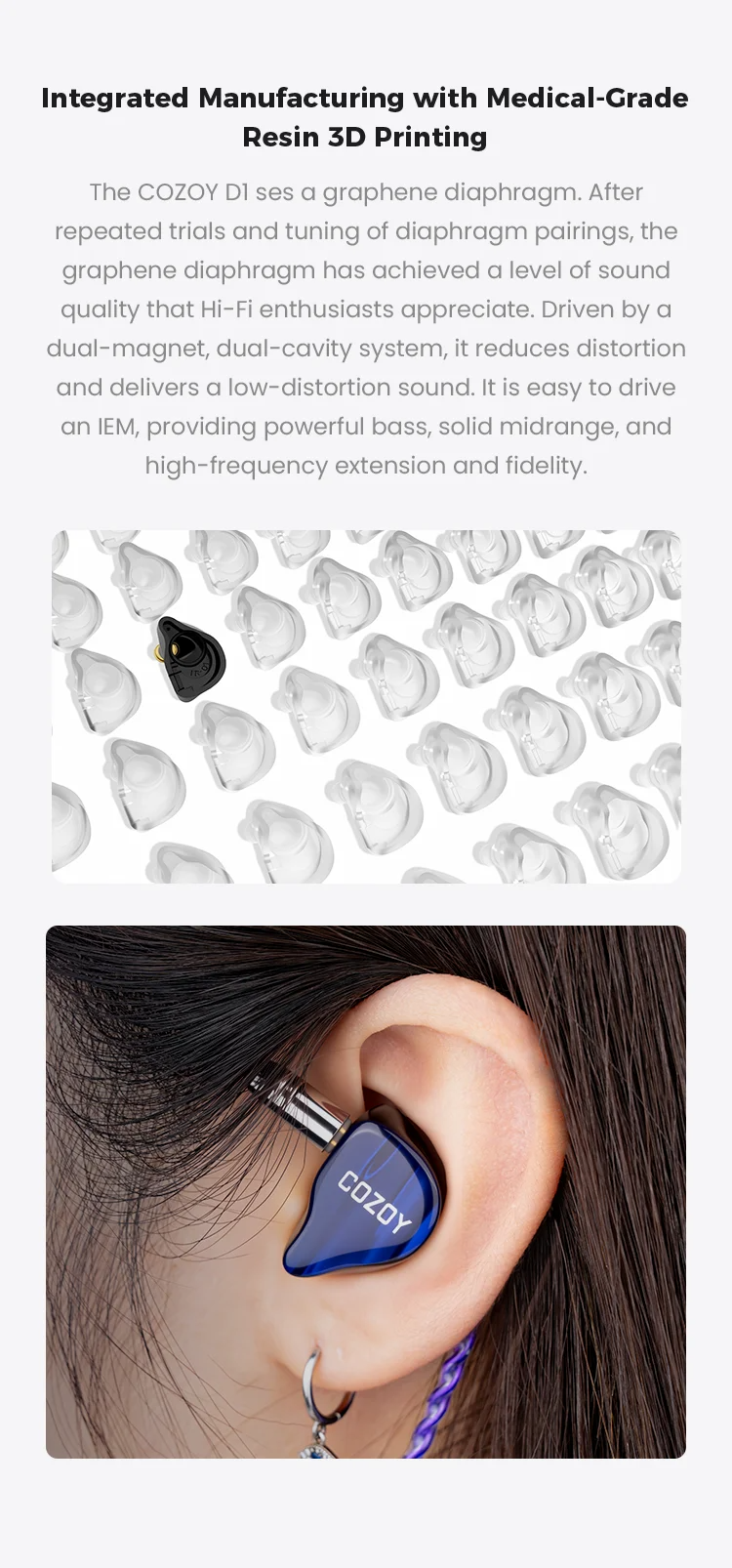 > The COZOY D1 uses a graphene diaphragm. After repeated trials and tuning of diaphragm pairings, the graphene diaphragm has achieved a level of sound quality that Hi-Fi enthusiasts appreciate. Driven by a dual-magnet, dual-cavity system, it reduces distortion and delivers a low-distortion sound. It is easy to drive an IEM, providing powerful bass, solid midrange, and high-frequency extension and fidelity.