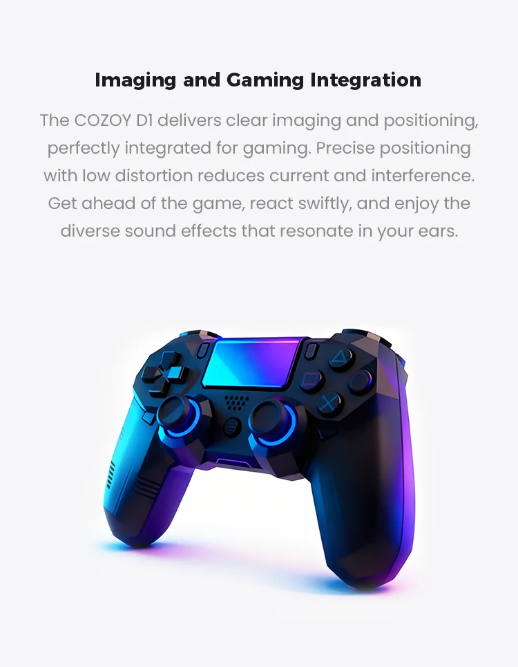 > The COZOY D1 delivers clear imaging and positioning, perfectly integrated for gaming. Precise positioning with low distortion reduces current and interference. Get ahead of the game, react swiftly, and enjoy the diverse sound effects that resonate in your ears.