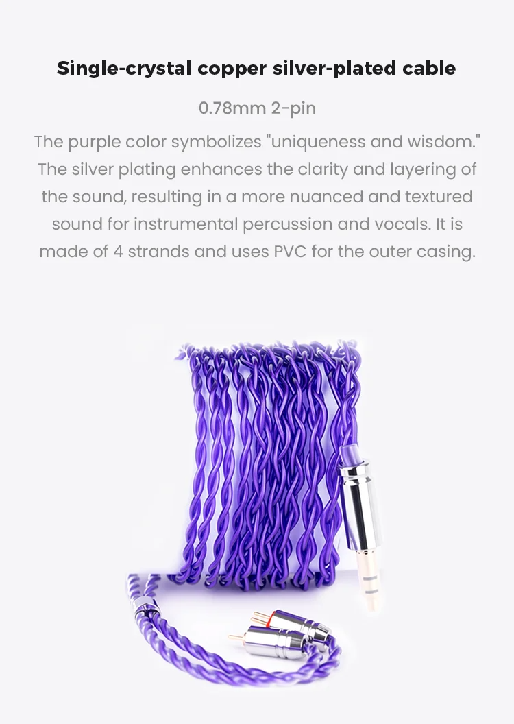 > The purple color symbolizes "uniqueness and wisdom." The silver plating enhances the clarity and layering of the sound, resulting in a more nuanced and textured sound for instrumental percussion and vocals. It is made of 4 strands and uses PVC for the outer casing.