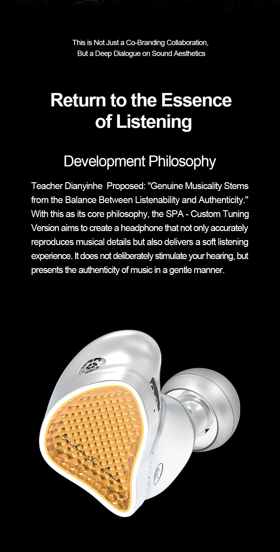> Teacher Dianyinhe Proposed: "Genuine Musicality Stems from the Balance Between Listenability and Authenticity." With this as its core philosoph, the SPA - Custom Tuning Version aims to create a headphone that not only accurately reproduces musical details but also delivers as soft listening experience. It does nt deliberately stimulate your hearing, but presents the authenticity of music in a gentle manner.