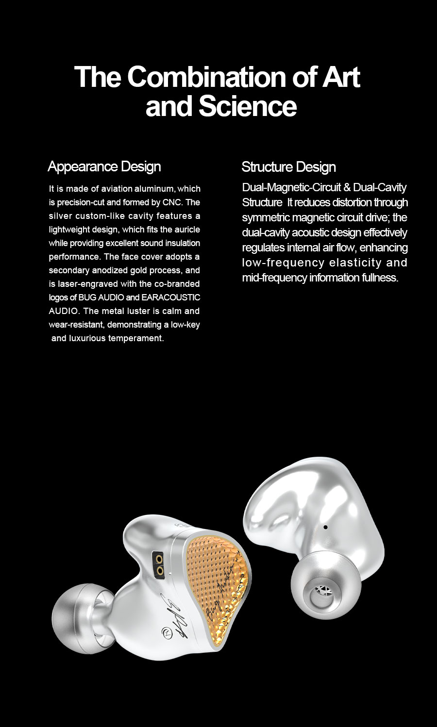 > It is made of aviation aluminum, which is precision-cut and formed by CNC. The silver custom-lik cavity features a lightweight design, which fits the auricle while providing excellent sound insulation performance. The face cover adopts a secondary anodized gold process, and is laser-engraved with the co-branded logos of BUG Audio and EARACOUSTIC Audio. The metal luster is calm and wear-resistant, demonstrating a low-key and luxurious temperament.