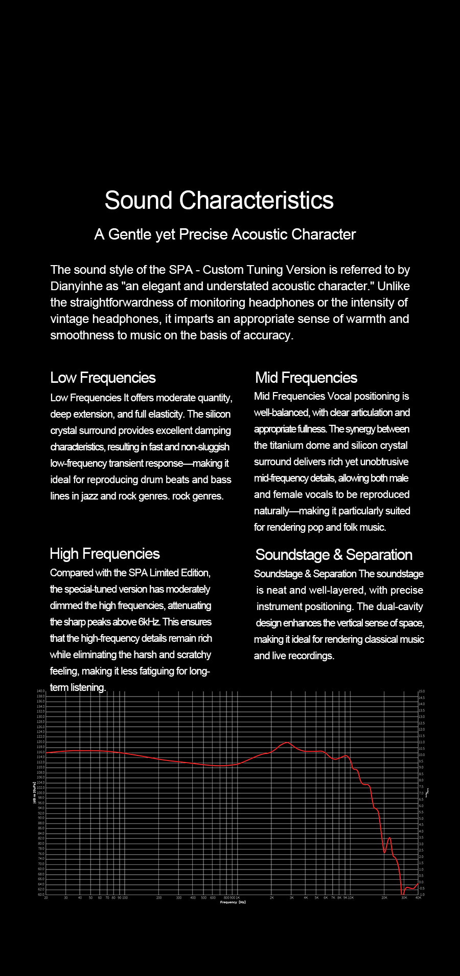 > The sound style of the SPA - Custom Tuning Version is referred to by Dianyinhe as "an elegant and undrestated acoustic character." Unlike the straightforwardness of monitoring headphones or the intensity of vintage headphones, it impartes an appropriate sense of warmth and smoothness to music on the basis of accuracy.