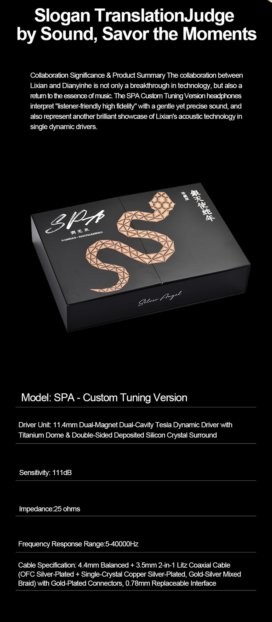 > Collaboration Significance & Product Summary. The collaboration between Lixian and Dianyinhe is not only a breakthrough in technology, but also return to the essence of music. The SPA Custom Tuning Version headphones interpret "listener-friendly high fidelity" with a gentle yet precise sound, and also represent another brilliant showcase of Lixian's acoustic technology in single dynamic drivers.