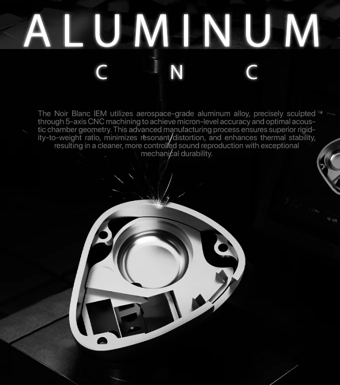 >The Noir Blanc in-ear headphones are made of aerospace-grade aluminum alloy, sculpted using 5-axis CNC machining to achieve micron-level precision and optimal acoustic chamber geometry. This advanced manufacturing process ensures an exceptional stiffness-to-weight ratio, minimizes resonance distortion, and enhances thermal stability, resulting in cleaner, more controllable sound reproduction and outstanding durability.