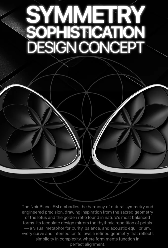 > The Noir Blanc embodies a harmonious unity of natural symmetry and engineering precision, inspired by the sacred geometric shape of the lotus and the golden ratio inherent in nature's most balanced forms. Its panel design reflects the rhythmic repetition of petals — a visual metaphor for purity, balance, and acoustic equilibrium.