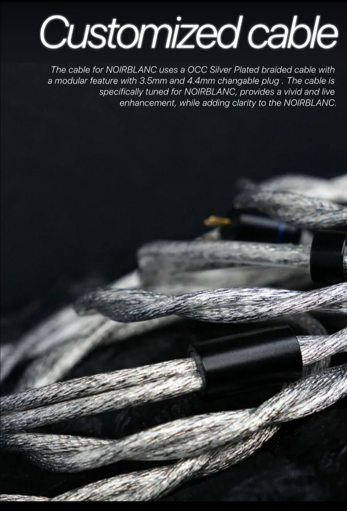> Custom Cables NOIRBLANC's headphone cables use single-crystal copper silver-plated braided wire with a replaceable plug design, allowing for interchangeable 3.5mm and 4.4mm plugs. This headphone cable is specially tuned for the NOIRBLANC, providing vivid and realistic sound enhancement while improving the NOIRBLANC's clarity.