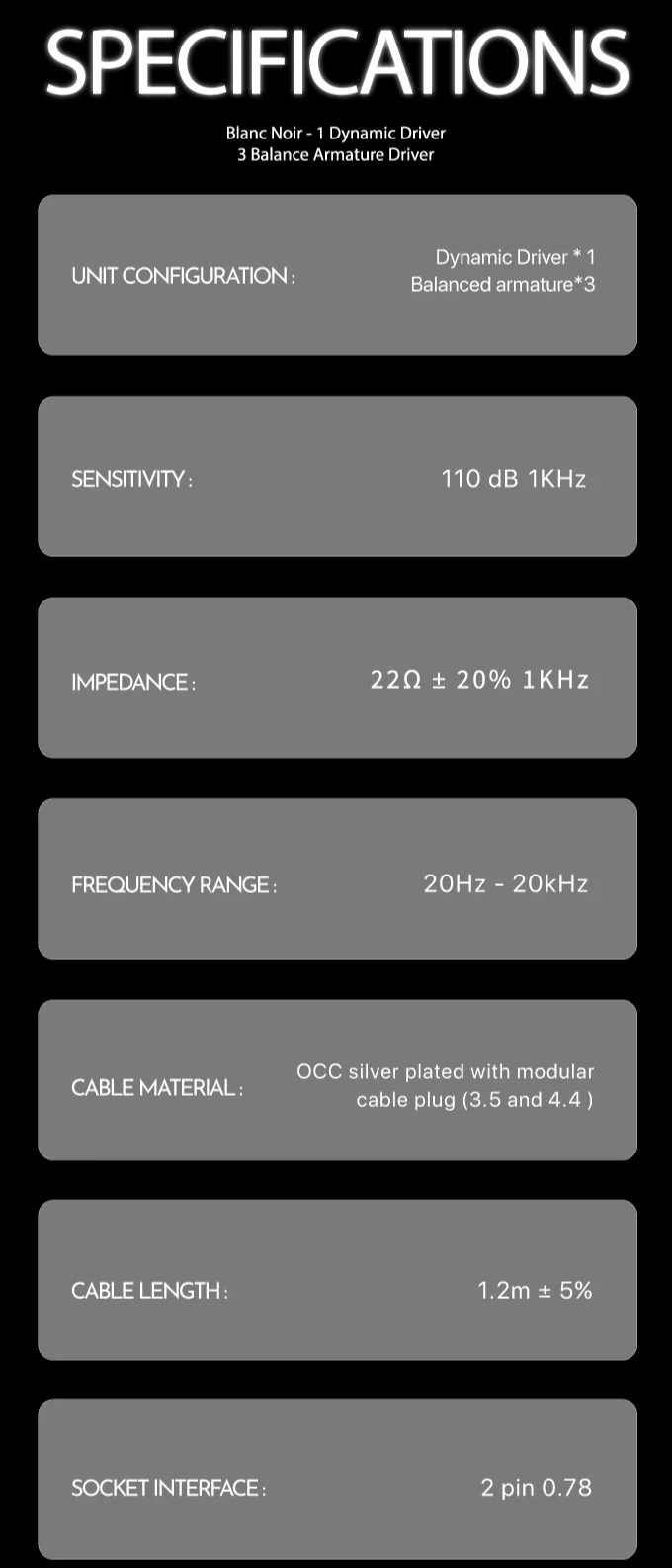 > Driver Configuration: Carbon Diaphragm Dynamic Driver * 1 | Balanced armature Drivers * 3