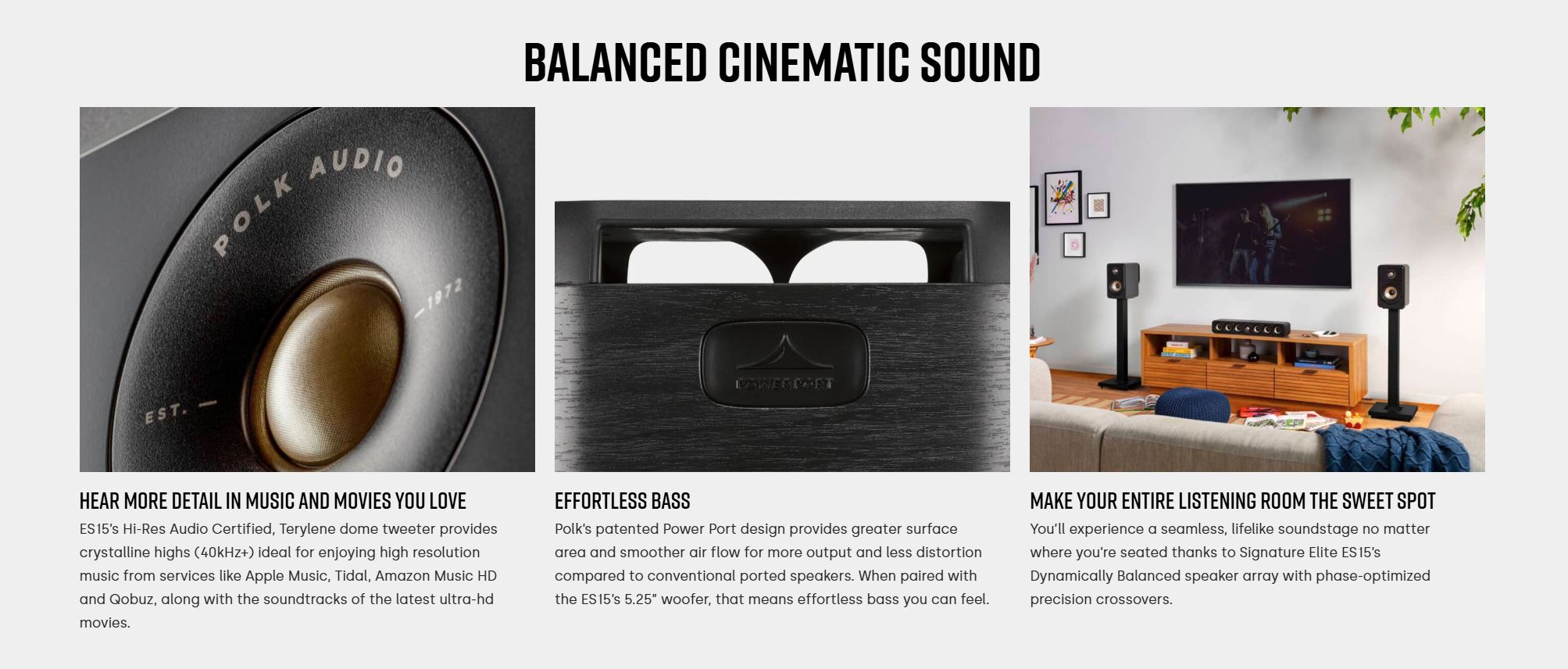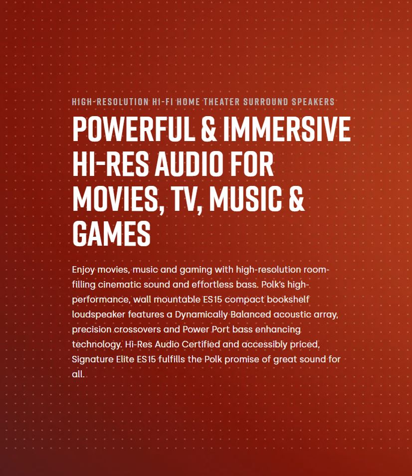 Enjoy movies, music and gaming with high-resolution room-filling cinematic sound and effortless bass. Polk’s high-performance, wall mountable ES15 compact bookshelf loudspeaker features a Dynamically Balanced acoustic array, precision crossovers and Power Port bass enhancing technology. Hi-Res Audio Certified and accessibly priced, Signature Elite ES15 fulfills the Polk promise of great sound for all.