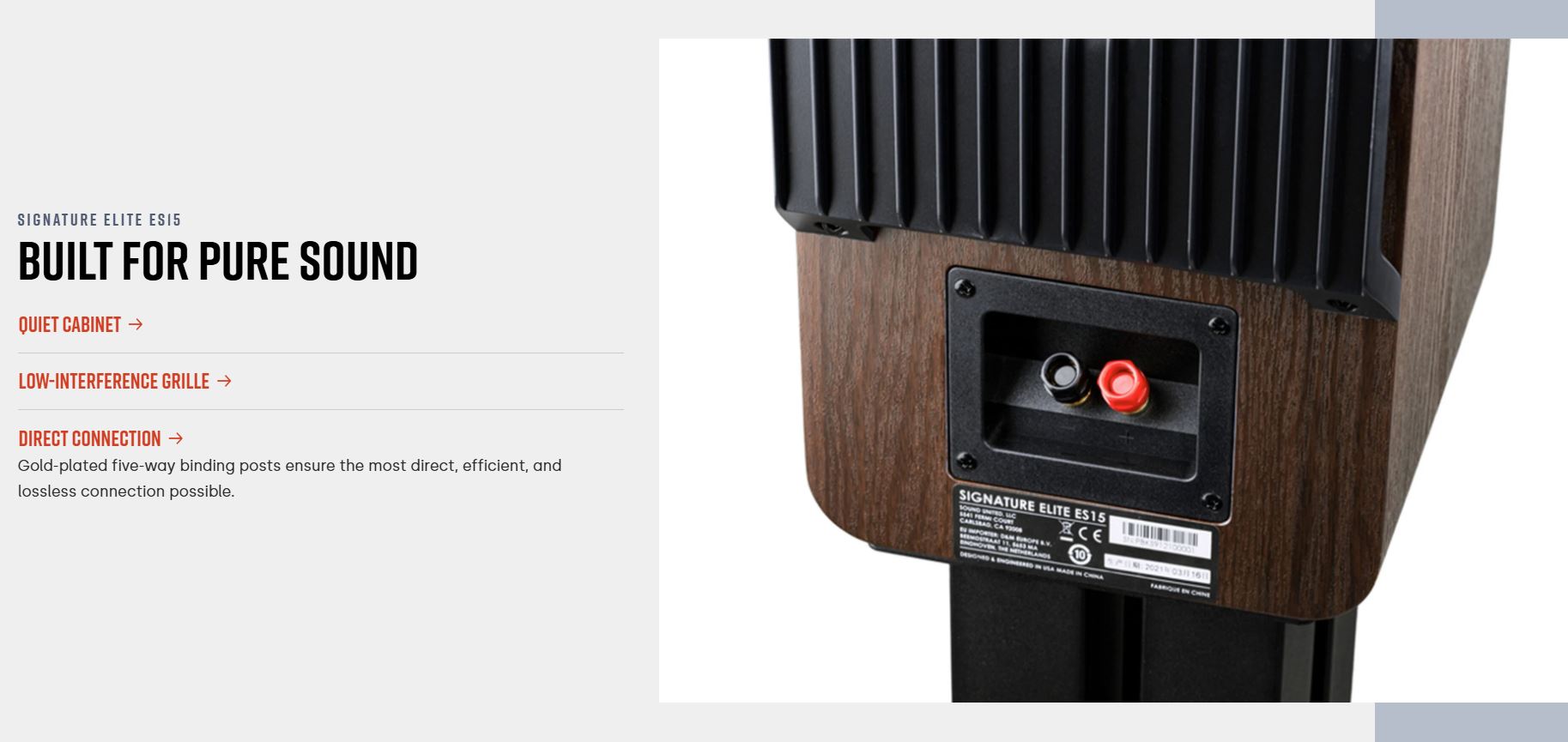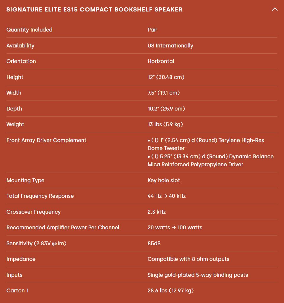 ES15 delivers spacious, clear, enveloping and realistic sound reproduction from nearly any amplifier or receiver—whether 4 or 8 ohm, vintage audiophile or the latest Dolby Atmos or DTS:X surround sound AVRs.